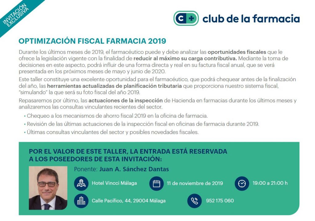 «Optimizacion Fiscal Farmacia 2.019». Málaga 11 noviembre 2.019.Club de la Farmacia Almirall