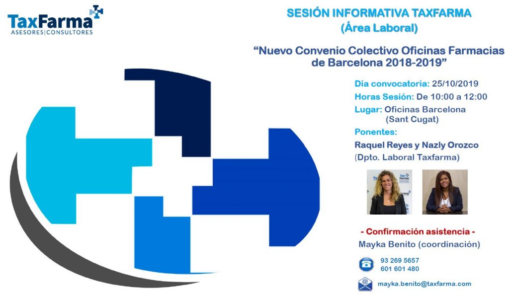 Le informamos, por si pudiera resultar de su interés, que el día 25 de octubre 2019 de 10:00 a 12:00, Taxfarma (Sant Cugat – Barcelona) realizará una sesión informativa enfocada al “Nuevo Convenio Colectivo Oficinas Farmacias de Barcelona 2018-2019”. Queremos poner en su conocimiento la entrada en vigor de este nuevo convenio, publicado el pasado […]