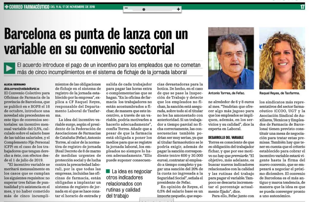 Nuestra compañera Raquel Reyes (responsable área laboral Taxfarma) analiza las principales novedades del Convenio Colectivo de Oficinas de Farmacia de Barcelona. Ver articulo integro en Correo Farmacéutico