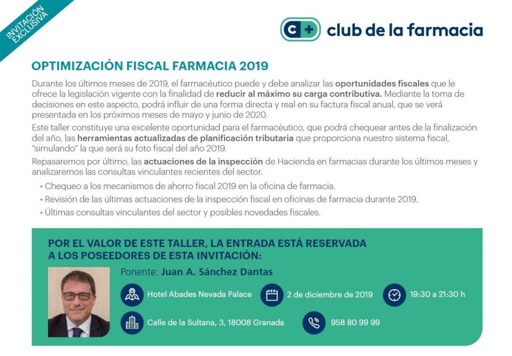 «Optimizacion Fiscal Farmacia 2.019». Granada 2 diciembre 2.019.Club de la Farmacia Almirall