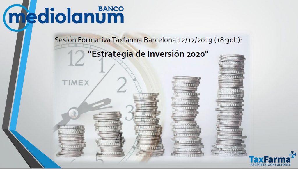 Apreciado Cliente / Colaborador: Le informamos, por si pudiera resultar de su interés, que el día 12 de diciembre de 2019 a las 18:30, Taxfarma (Barcelona) realizará la una sesión formativa gratuita orientada a la “Estrategia de Inversión 2.020”. En dicha sesión, se tratarán principalmente las perspectivas financieras del actual año 2019, así como un […]