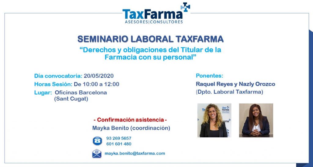 El próximo día 20 de mayo 2020 de 10:00 a 12:00h, Taxfarma (Sant Cugat – Barcelona) realizará una sesión formativa gratuita enfocada a “Derechos y obligaciones del Titular de la Farmacia con su personal ”. La sesión será impartida por Raquel Reyes (Responsable Dpto. Laboral Taxfarma – Graduada Social 4583) y Nazly Orozco (Técnico Dpto. […]