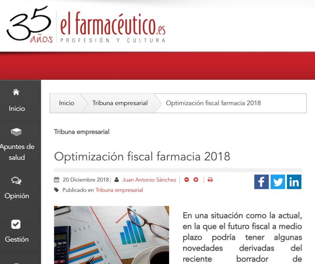 Nuestra tribuna empresarial en la revista «El Farmacéutico».Numero 569 En una situación como la actual, en la que el futuro fiscal a medio plazo podría tener algunas novedades derivadas del reciente borrador de presupuestos generales para 2019, parece oportuno centrarse ahora en intentar optimizar la factura fiscal de la oficina de farmacia en el año […]