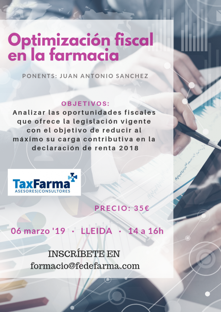 «Optimización Fiscal Farmacia Renta 2.018». 6 marzo 2019. Fedefarma LLeida