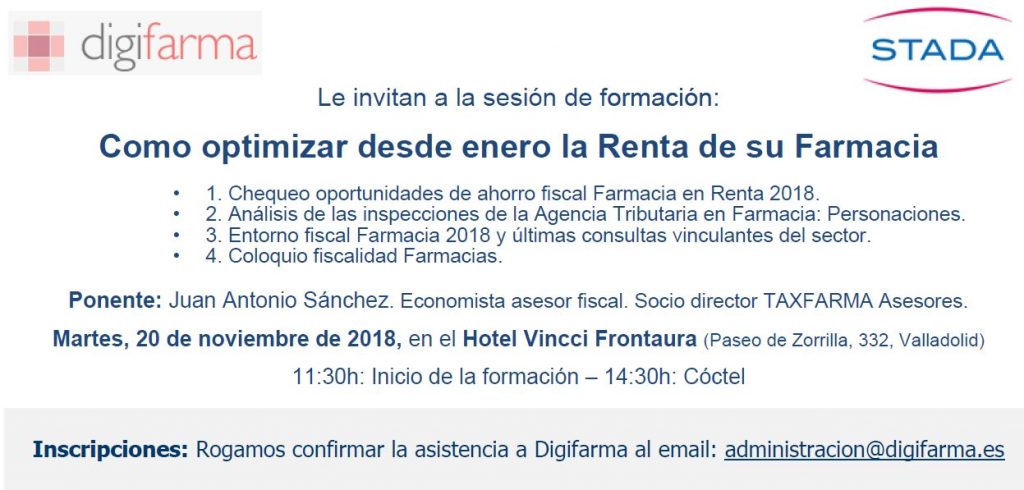 «Como optimizar desde enero la Renta de su Farmacia». Stada . 20/11/2018. Valladolid