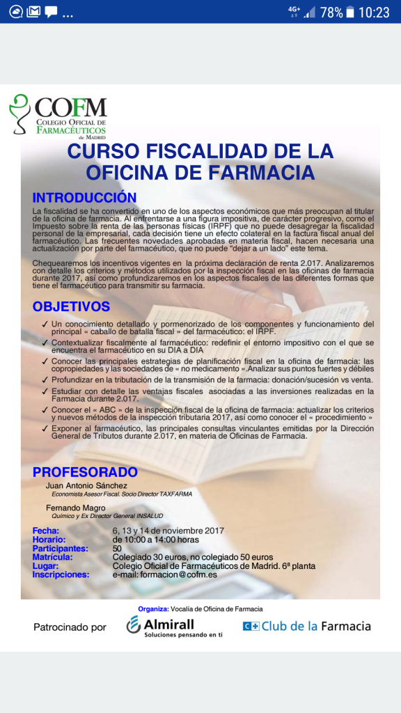 Información e inscripciones OPTIMIZACIÓN FISCAL EN LA FARMÀCIA 2017