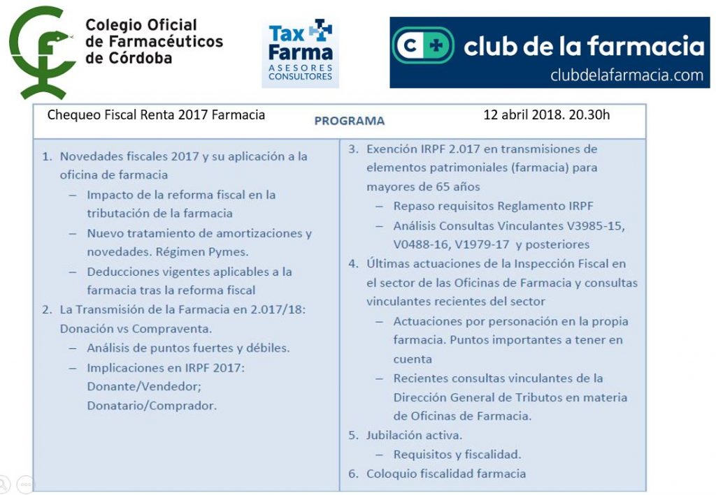 «Chequeo Fiscal Renta 2.017 Farmacia». Colegio Farmacéuticos Cordoba