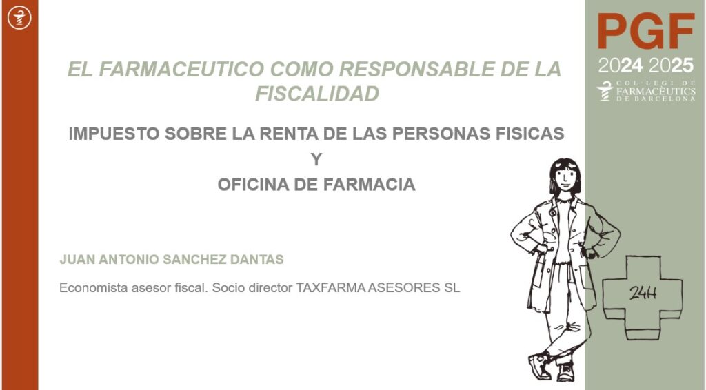 Los próximos 28 y 30 de enero 2.025, Juan Antonio Sanchez, economista asesor fiscal y socio director de TAXFARMA ASESORES, S.L. impartirá dos sesiones formativas dentro del PGF 2024-25 del Col·legi de Farmacèutics de Barcelona Mas info sobre el PGF 2024-25 de Col·legi de Farmacèutics de Barcelona : https://farmaceutics.cofb.net/documents/10186/8137487/PGF+2024+2025+interactiu+CAST.PDF/b58dca5e-c9ee-4adb-aeae-824fb21f2270