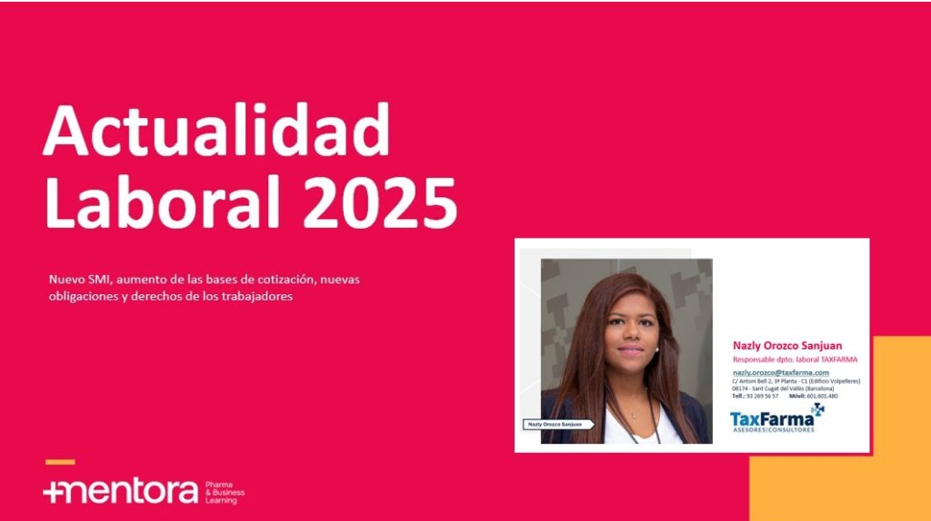 El día 4 de marzo 2025, a las 14:00h, nuestra compañera Nazly Orozco, responsable del área laboral de Taxfarma impartirá una formación online sobre «Actualidad Laboral en las Farmacias» en la plataforma Mentora One de Fedefarma. Para mas informacion, https://mentorafarma.com/