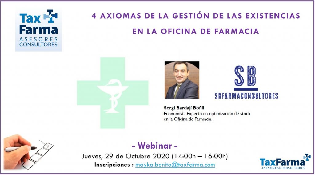 El próximo 29 de octubre de 2020, Taxfarma organizará un seminario formativo online gratuito (de 14:00 a 16:00h), orientado a «4 Axiomas de la Gestión de Existencias en la Oficina de Farmacia» Un axioma es una “Proposición o enunciado tan evidente que se considera que no requiere demostración”. ¿Es sinónimo decir que una farmacia ha […]