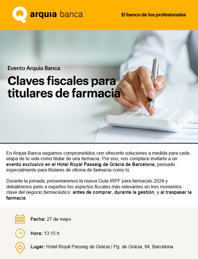 En Arquia Banca seguimos comprometidos con ofrecerte soluciones a medida para cada etapa de tu vida como titular de una farmacia. Por eso, nos complace invitarte a un evento exclusivo en el auditorio de nuestra sede , pensado especialmente para titulares de oficina de farmacia como tú.