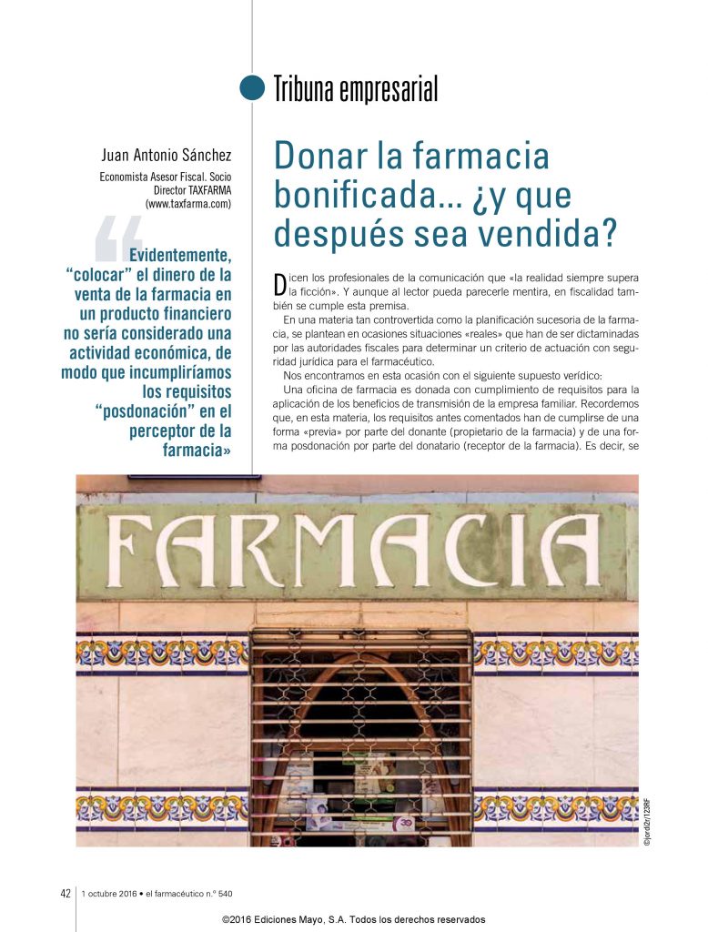 Puedes leer nuestra última entrada en la revista El Farmacéutico en la que hablamos de donaciones de farmacia ¿están bonificadas?y después de ser vendida ¿qué pasa?