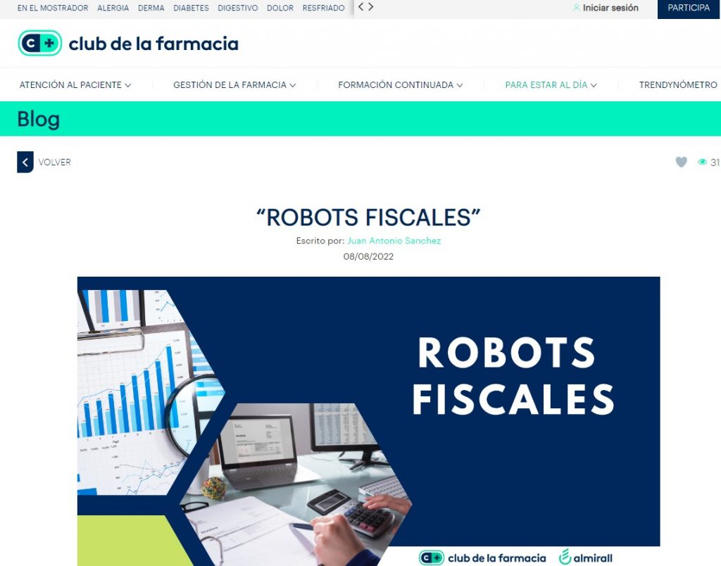 Nuestra colaboración de agosto 2.022 en el Blog del Club de la Farmacia Almirall Juan Antonio Sanchez, economista socio director de Taxfarma, analiza en este articulo como la Agencia Tributaria utiliza los robots para sus gestiones ante los contribuyentes. Acceso integro link debajo https://www.clubdelafarmacia.com/para-estar-al-dia/el-blog-del-club/robots-fiscales/