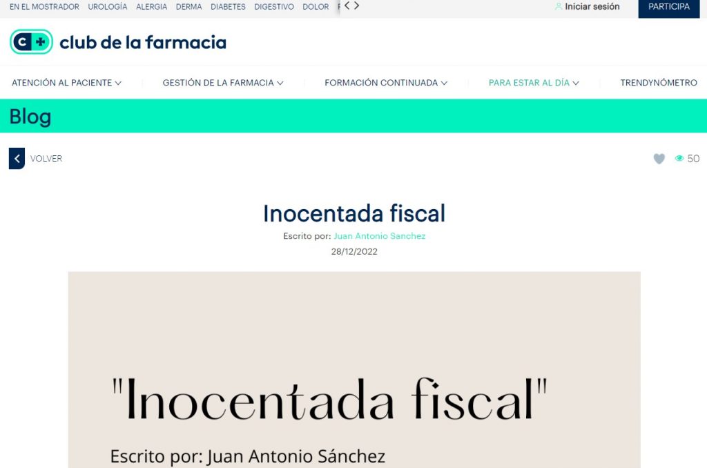 Nuestra opinión en Mundo Farmacéutico. Juan Antonio Sanchez, economista socio director de Taxfarma, analiza en este articulo, como afecta a la farmacia, el nuevo Plan anual de Control Tributario y Aduanero. Acceso integro link debajo hhttps://www.mundofarmaceutico.es/-/tu-farmacia-al-dia/farmanews/farmaeconomia/la-farmacia-ante-la-inspeccion-de-hacienda-los-riesgos-tributarios-de-2023