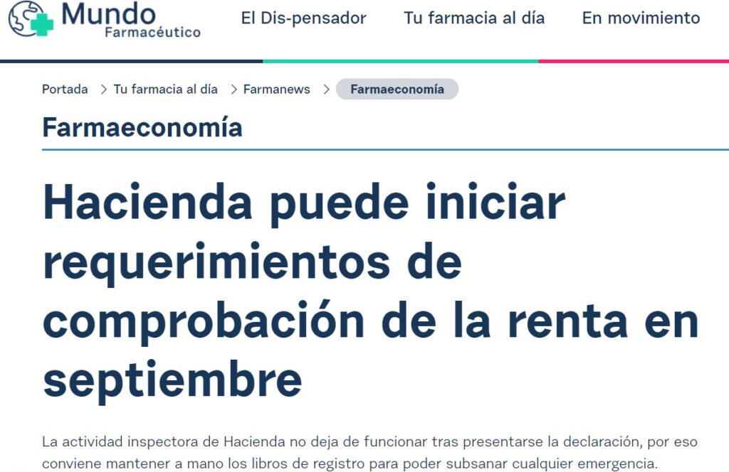 Nuestra opinión en Mundo Farmacéutico. Juan Antonio Sanchez, economista socio director de Taxfarma, opina en este articulo, sobre este controvertido asunto entre las farmacias y la Agencia Tributaria. Acceso integro link debajo https://www.mundofarmaceutico.es/-/tu-farmacia-al-dia/farmanews/farmaeconomia/hacienda-puede-iniciar-requerimientos-de-comprobacion-de-la-renta-en-septiembre