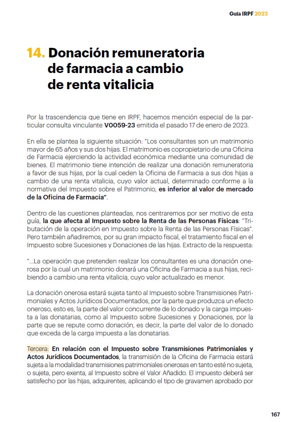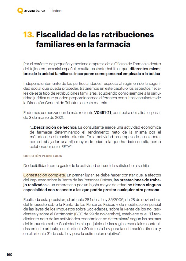 Capitulo 13 «Guía IRPF2023 para la oficina de farmacia» En este capitulo, analizamos la fiscalidad de este tipo de retribuciones familiares, mediante consultas vinculantes de la Dirección General de Tributos. Disponible en nuestra «Guía IRPF2023 para la Farmacia» patrocinada y editada por ARQUIA BANCA Link descarga gratuita en ARQUIA BANCA : https://www.arquia.com/es-es/formularios/guia-irpf2023-farmacias/#formulario-descarga-guia